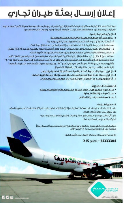 إعلان طيران الجزيرة عن إرسال بعثة طيران تجاري للكويتيين فقط على نفقتهم الخاصة. للمزيد من المعلومات إضغط هنا للمشاركة Click to share on Facebook (Opens in new window) Facebook Click to share on X (Opens in new window) X Click to share on Pinterest (Opens in new window) Pinterest Like Loading... Related