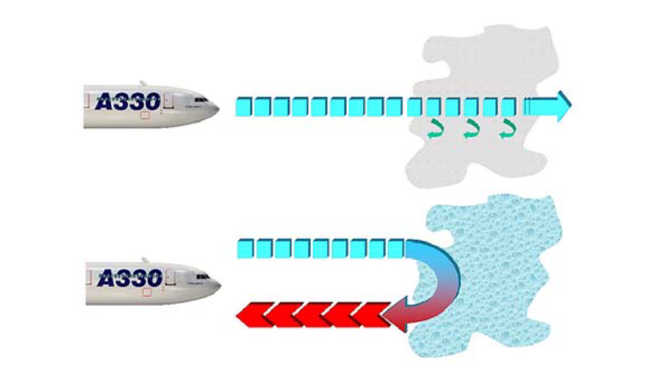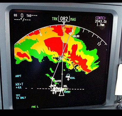 في الصورة تشاهد الطريقة التي تظهر فيها الغيوم امام الطيار ليتعرف على الأماكن الخطرة و أماكن المطبات الجوية ليتم تفاديها بالتنسيق من المراقب الجوي و لا يتم ابدا رفض طلب الطيار لتفادي احوال جوية سيئة حفاظا على سلامة الجميع.