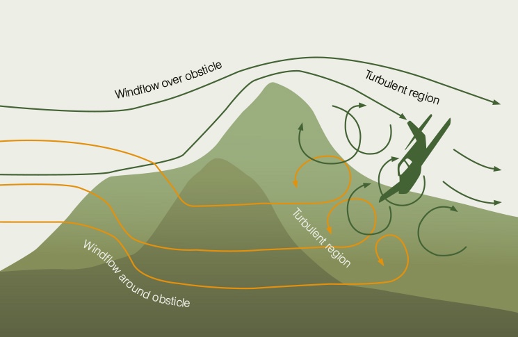 التضاريس الجبلية: عندما يتعرض الهواء للتضاريس الجبلية أو التلال الكبيرة، يمكن أن يضطر الهواء إلى الارتفاع أو الهبوط بسرعة. وهذا يمكن أن يؤدي إلى تكوين اضطرابات موجية جبلية، والتي تحدث على الجانب المعرض للرياح (كما هو موضح في الصورة).