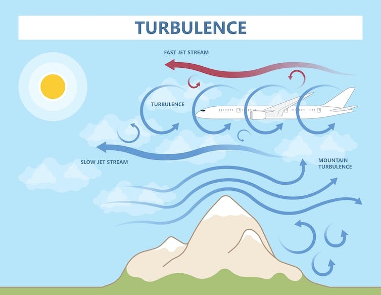 الظروف الجوية: يمكن أن تحدث الاضطرابات بسبب تغيرات في ضغط الهواء، ودرجة الحرارة، وأنماط الرياح في الغلاف الجوي. يشمل ذلك مناطق نظام الضغط العالي والمنخفض، وتيارات الجت، والجبهات الجوية. يمكن أن تؤدي هذه التغيرات في الظروف الجوية إلى تكون جيوب من الهواء المضطرب.